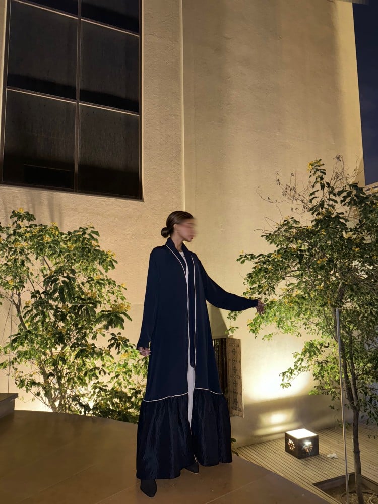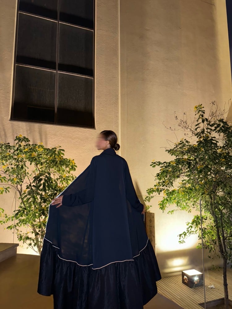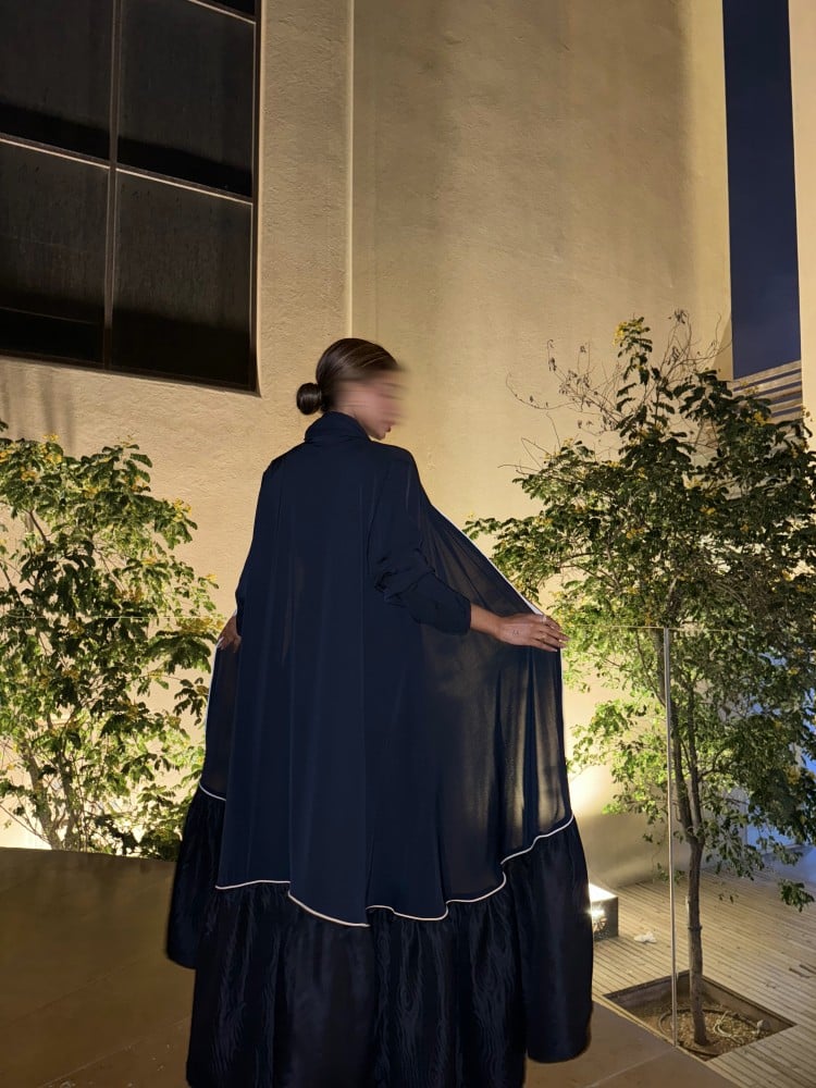 القمــاش كـريب(كحلي)•من تحت جاكار هندي وتحديد ابيض كريب•قصـه كلوش